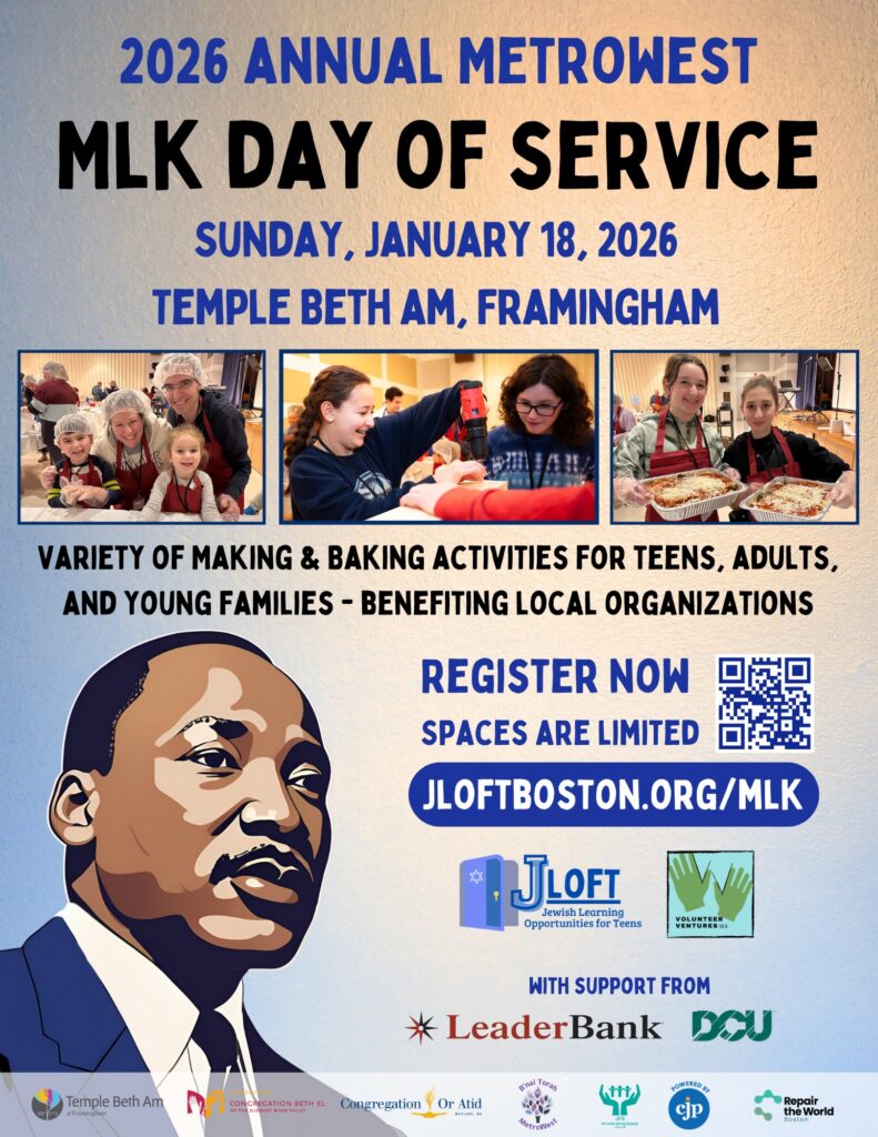 On Sunday, January 18, the MetroWest community will come together at Temple Beth Am for a meaningful MLK Day of Service, organized in partnership with JLoft. This annual day of action honors Dr. Martin Luther King Jr.’s legacy by turning values into impact—through hands-on service, learning, and community connection.