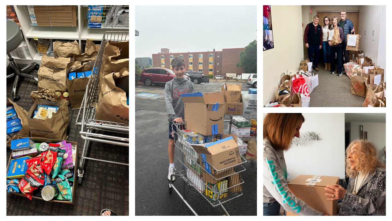 *Photo captions, from left: The JFS Lucy and Joe Press Food Pantry provides emergency food assistance to frail older adults and families in our community to meet basic nutritional needs; Volunteer Mikey Darish organized a food drive for is Bar Mitzvah, donating non-perishable items to the JFS Food Pantry; The Neighbor’s Project coordinated a food drive to support immigrant families experiencing food insecurity as benefits were temporarily unavailable and access to food was limited; Sponsored by CJP, JFS coordinates the distribution of hundreds of Passover meals to low-income community members across Massachusetts (photo: Anna Bloxham).