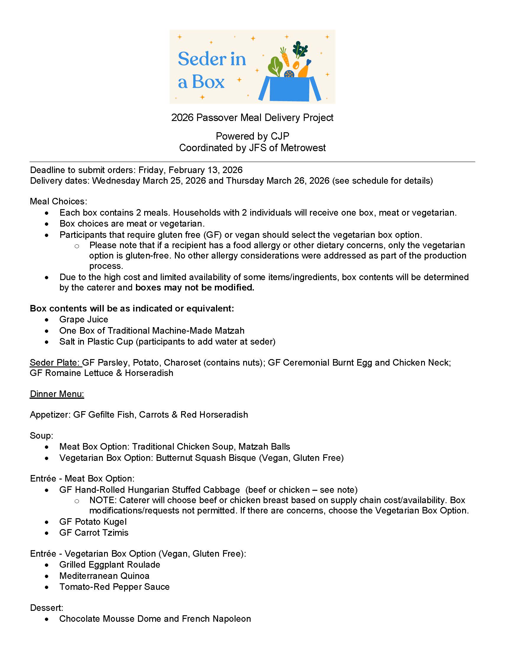 Made possible by Combined Jewish Philanthropies (CJP) with Jewish Family Service of Metrowest (JFS) as the point for the operation, and in collaboration with Jewish Family and Children’s Service (JF&CS), Yad Chessed, and Yachad, we’re lending a hand to those who are living in the community and are in need by providing complimentary, home-delivered meal boxes this Passover.